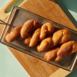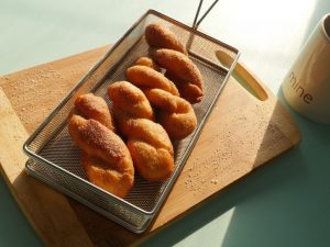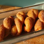 Take a piece of dough and roll it out on your working place so it forms a rope 8 inches long and ½ inch in diameter.If it’s sticky,sprinkle some flour on the area you’re working in.When you roll out the dough, move one hand upward and the other downward so that the rope is twisted in between your hands as you roll it (makes 15-16).