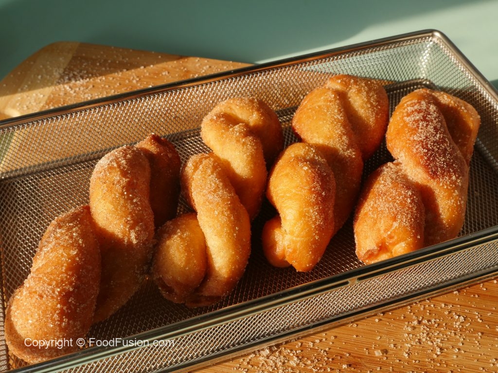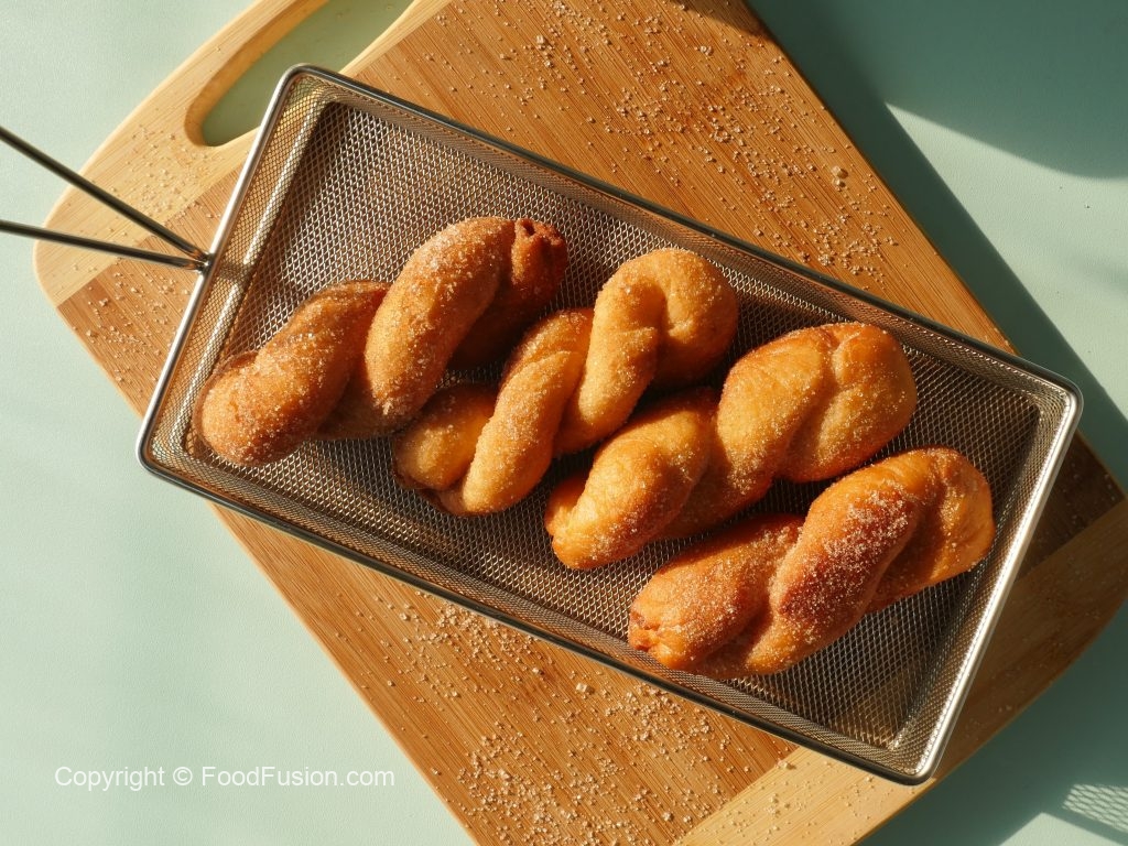 Twisted donuts ko cheeni+darchini ka mixture mein dal ker ache tarhan coat ker lein.