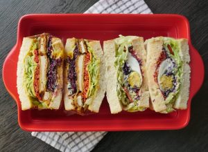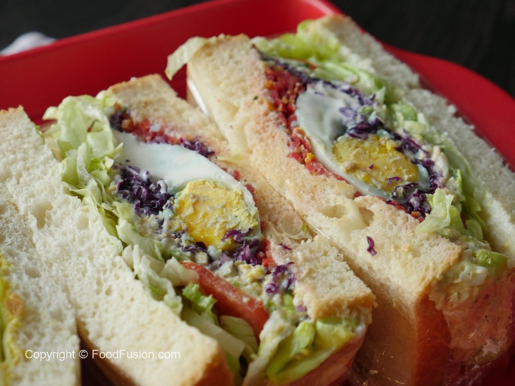 On cling film,place bread slices,spread cream cheese,ice berg,tomato slices,cucumber,egg & chicken mixture,purple cabbage mixture,boiled egg,carrot mixture and top with another slice,wrap in cling film then cut into two pieces & serve!