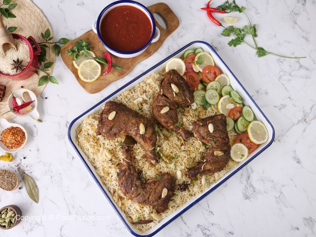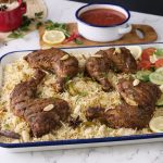 -Garnish with almonds,fresh coriander & serve chicken mandi with mandi rice & sauce!